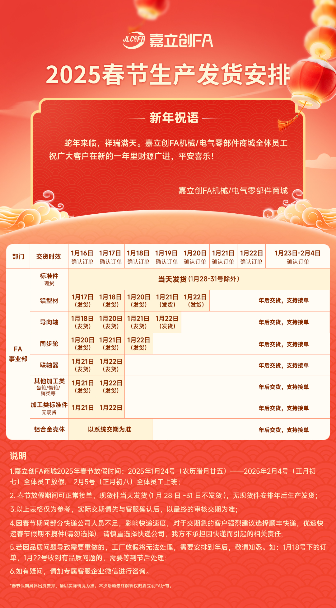 春节期间如您有紧急需求可在嘉立创FA官网右侧联系您的专属客服协调沟通发货问题,为避免影响您的订单交期,请尽快安排您的零部件采购需求。嘉立创FA机械/电气零部件商城全体员工提前祝您新年快乐!