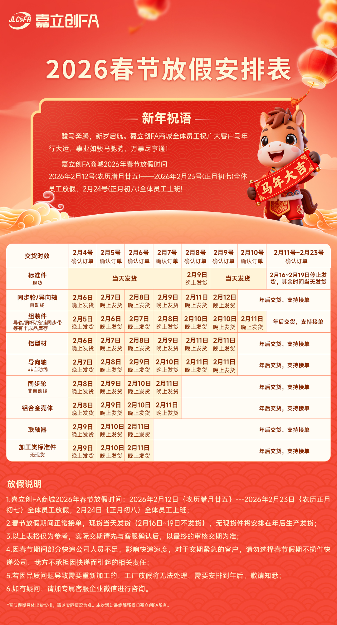 辞旧迎新启新程,马年纳福赴新章!首先,衷心感谢您过去一年对嘉立创FA机械/电气零部件商城的信任与鼎力支持。临近春节,结合公司整体运营及生产安排,现将春节期间生产交期、放假及复工相关事宜公告如下,敬请您知悉并提前做好采购规划。