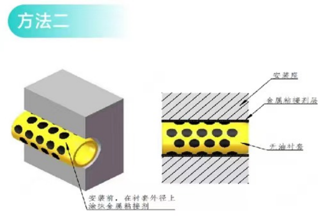 金属胶粘剂粘接法:应用在低负载、温度不高的场景下,为了防止无油衬套的脱落和运动时旋转问题,可采用金属胶粘剂对衬套进行固定。安装时对安装座内径和衬套外径涂抹少量的金属胶粘剂。