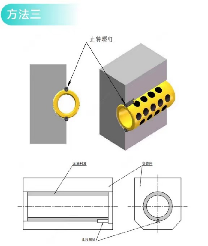 止转螺钉法:应用在高负载、高温度的场景下,为了防止无油衬套的脱落和运动时旋转问题,将无油衬套压入安装座固定好后,在无油衬套和安装座的压装边界,从轴向加工出螺孔并设置止转螺钉,从而防止无油衬套在固定座内旋转。这种结构对无油衬套内径的变形影响很小,不会造成间隙问题。