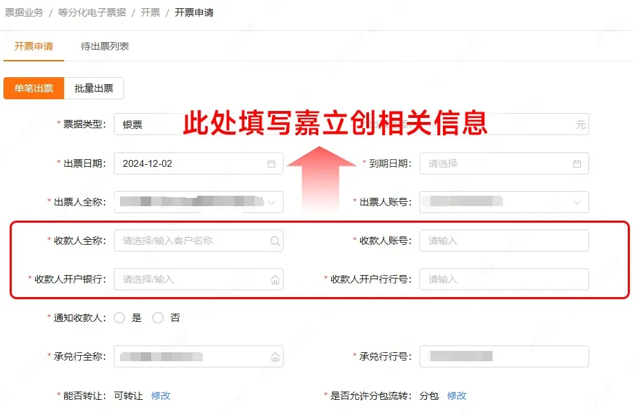 ① 如何开具:在票据业务中选择【开票申请】,并按银行要求填写相关信息。其中,【收款人】一栏填写嘉立创相关信息。