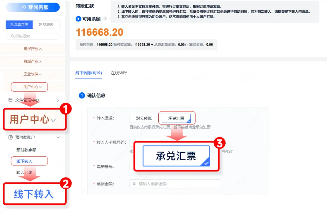 02 在嘉立创下单系统中,依次选择【用户中心】→【线下转入】→【承兑汇票】,输入“转入人手机号码、票据号码及票据金额”等相关转账信息。步骤如图:
