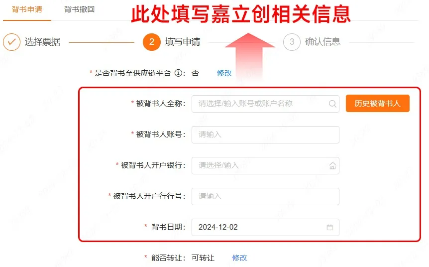 ② 如何背书:选择您要背书的票据,在【被背书人】一栏填写嘉立创相关信息。