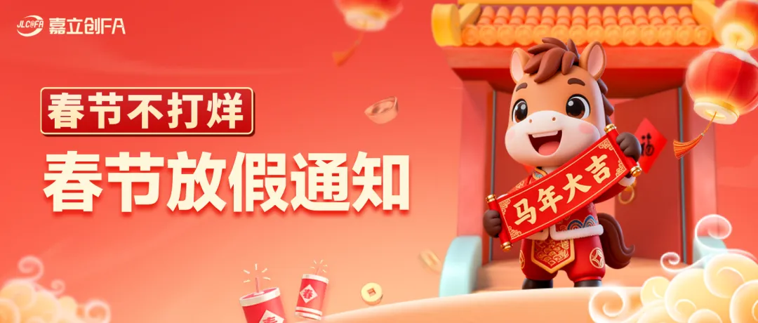 辞旧迎新启新程,马年纳福赴新章!首先,衷心感谢您过去一年对嘉立创FA机械/电气零部件商城的信任与鼎力支持。临近春节,结合公司整体运营及生产安排,现将春节期间生产交期、放假及复工相关事宜公告如下,敬请您知悉并提前做好采购规划。