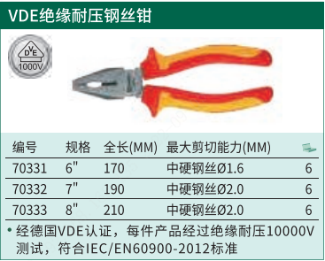 已选属性 种类:钳子 | 最大剪切能力:中硬钢丝2mm | 单件/组套:单件 | 类型:VDE绝缘耐压钢丝钳 | 规格:8" | 总长:210mm