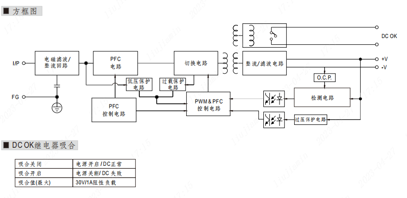 | 耐压 | I/P-O/P:3KVAC I/P-FG:2KVAC O/P-FG:0.5KVAC O/P-DC OK:0.5KVAC |