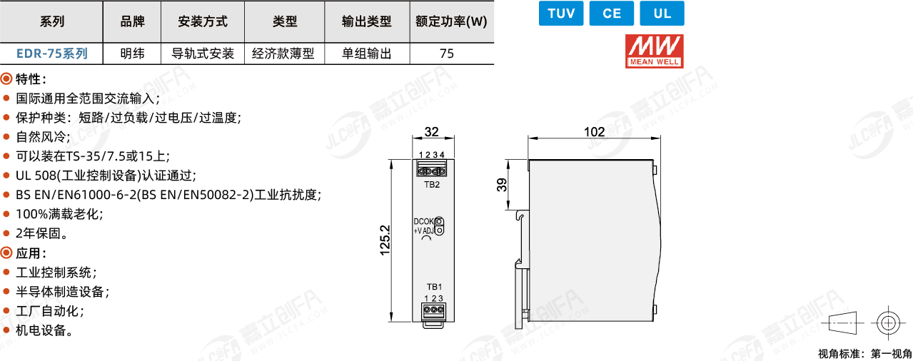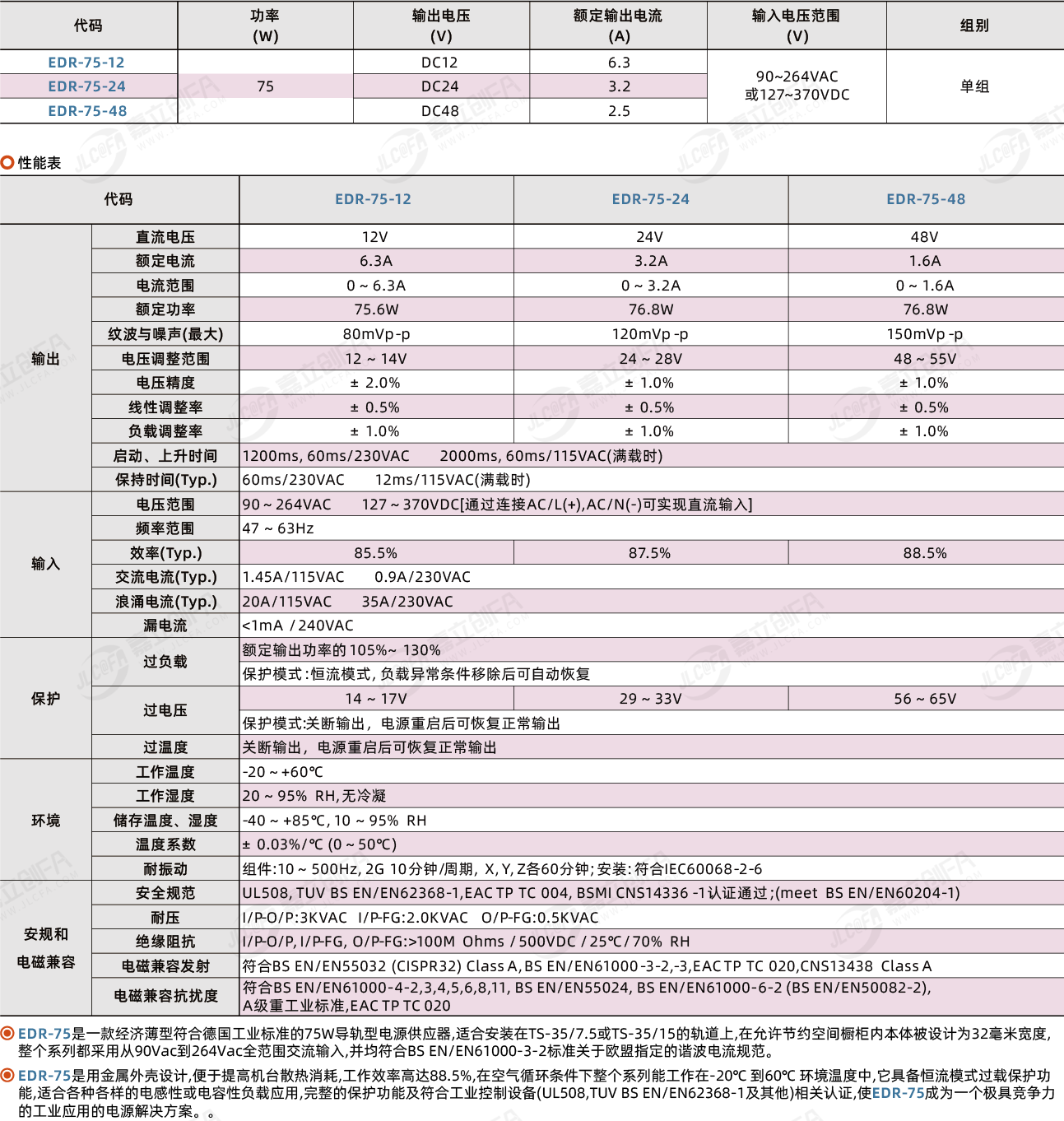 EDR-75是一款经济薄型符合德国工业标准的75W导轨型电源供应器,适合安装在TS-35/7.5或TS-35/15的轨道上,在允许节约空间橱柜内本体被设计为32毫米宽度,整个系列都采用从90Vac到264Vac全范围交流输入,并均符合BS EN/EN61000-3-2标准关于欧盟指定的谐波电流规范。