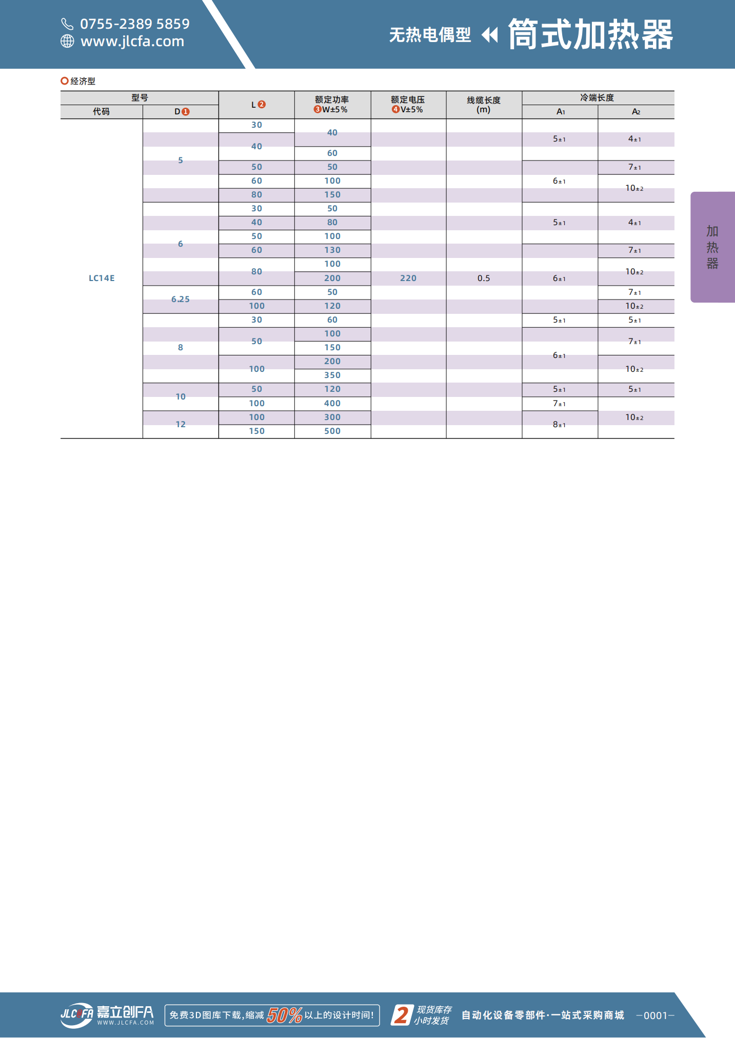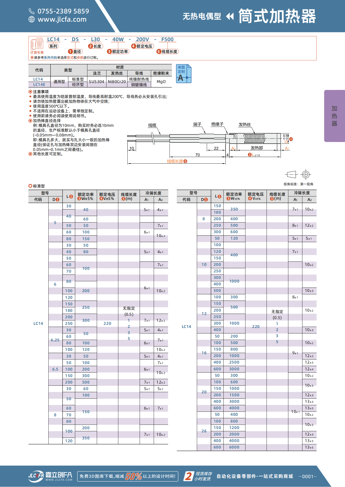 已选属性 种类:加热器 | 电压V:220VAC | 本体材质:SUS304 | 接线方式:外接线 | 导线类型:纯镍耐热线 | 功率W:120 | 使用温度:500°以下 | 系列:LC14 | 导线长度:0.5m | 长度L:50 | 直径D:10 | 类型:通用型 | 形状:圆柱
