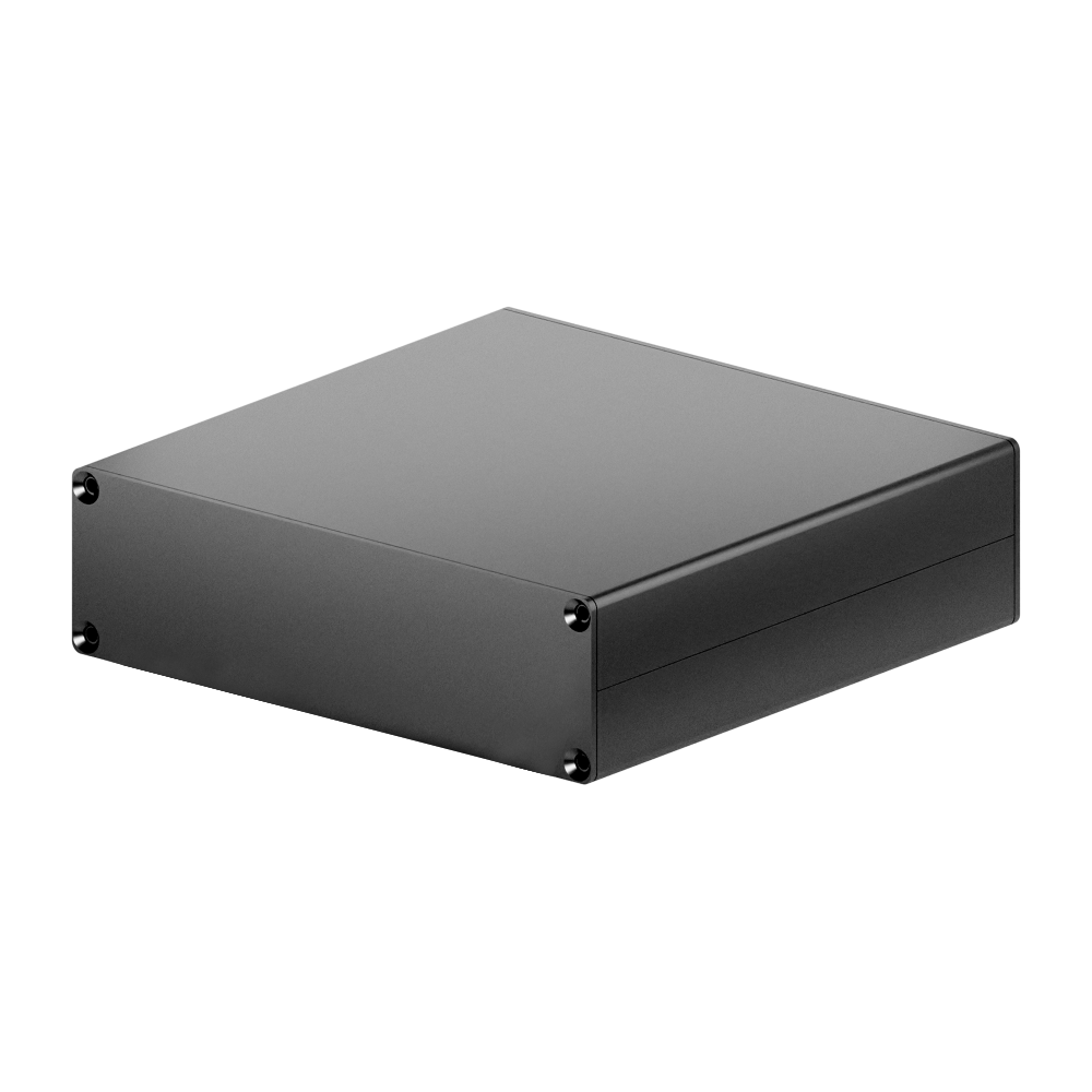 铝型材壳体,广泛应用于电子产品行业,通常用于保护和容纳电子设备、机械组件或其他敏感物品。整体由壳体+前后挡板+8颗螺丝三部分组成,壳体内部设有PCB插槽或其他可选固定方式,方便电路板与元器件的灵活固定。表面喷砂或拉丝后阳极氧化处理。处理后的表面可使用激光镭射或UV彩印添加字体和LOGO。