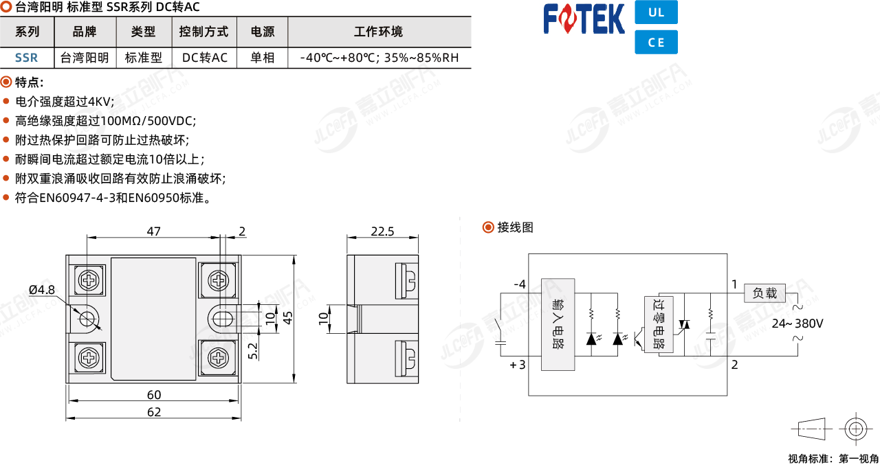 阳明(FOTEK) 固态继电器 SSR 标准型 DC转AC SSR-40DA 型号:SSR-40DA
