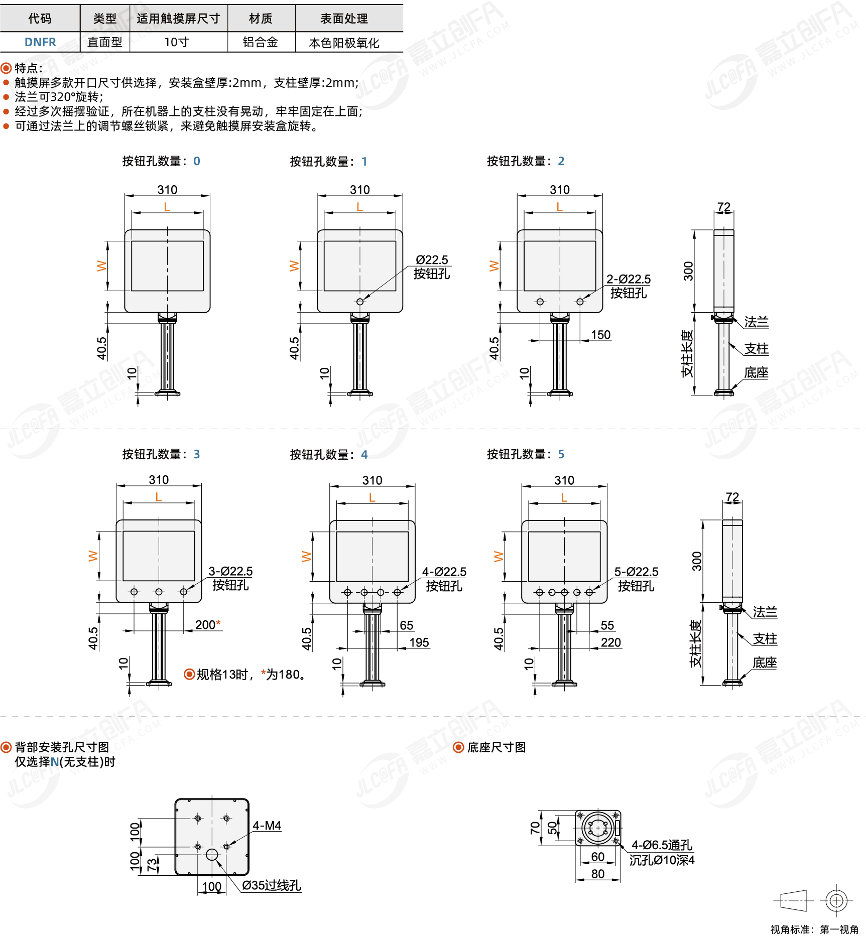 种类: 触摸屏安装盒安装类型: 立式安装方式: 锁孔安装表面处理: 本色阳极氧化按钮孔位置: 下方适用触摸屏尺寸: 10寸支架材质: 铝合金主体高度是否可调: