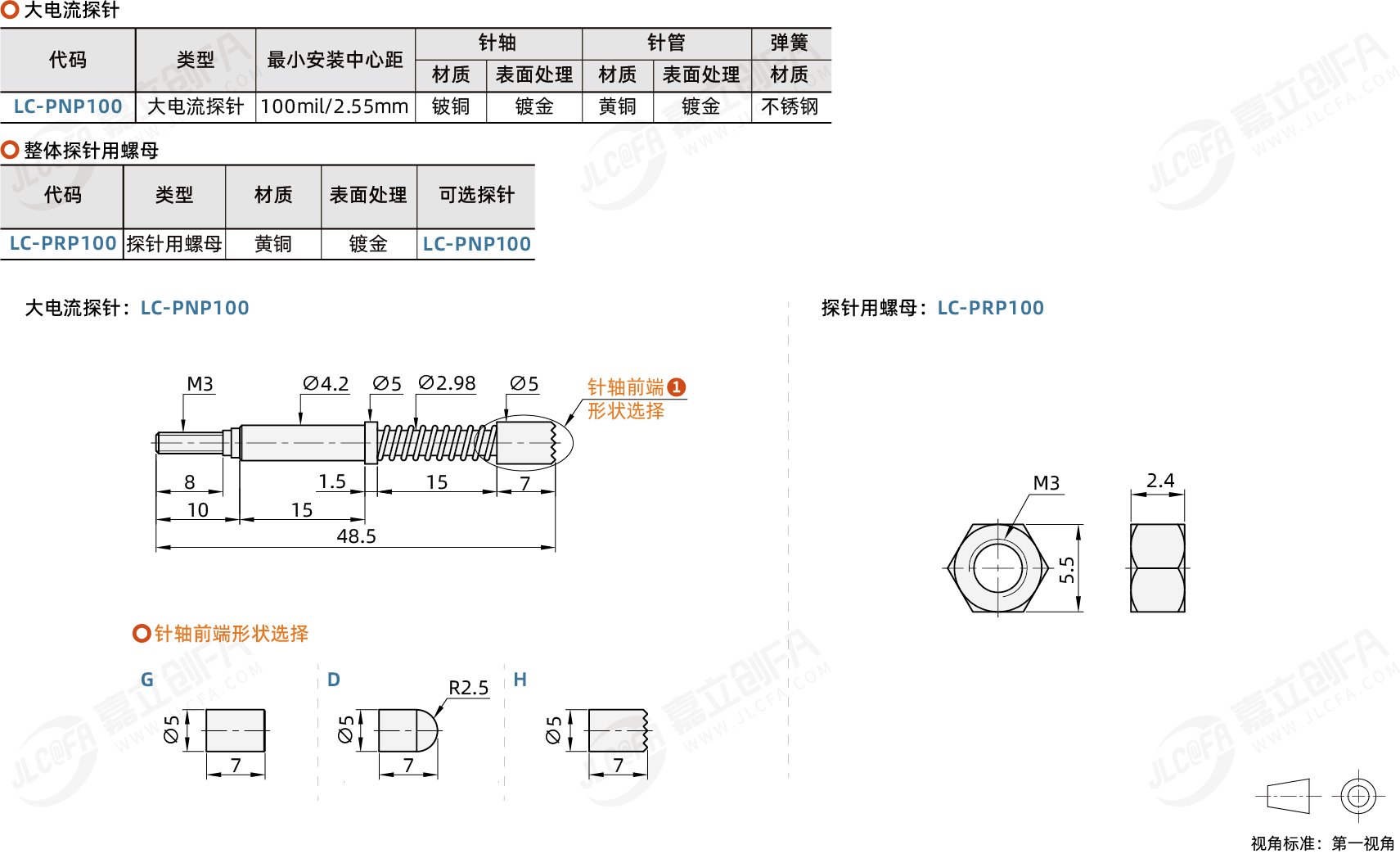 整体探针/整体探针用螺母 大电流探针 标准型 最小安装中心距100mil/2.55mm