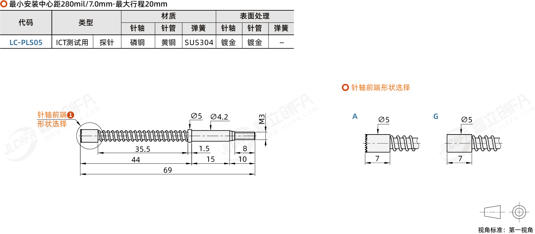 探针(ICT测试用) 标准型 最小安装中心距280mil/7.0mm·最大行程20mm