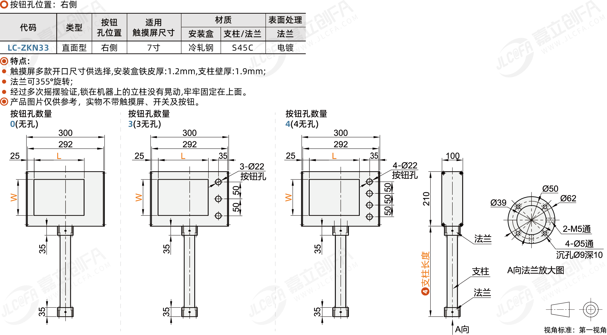 种类: 触摸屏安装盒安装类型: 立式安装方式: 法兰安装类型: 直面型按钮孔位置: 右侧适用触摸屏尺寸: 7寸安装盒材质: 冷轧钢支柱/法兰材质: S45C法兰表面处理: 电镀