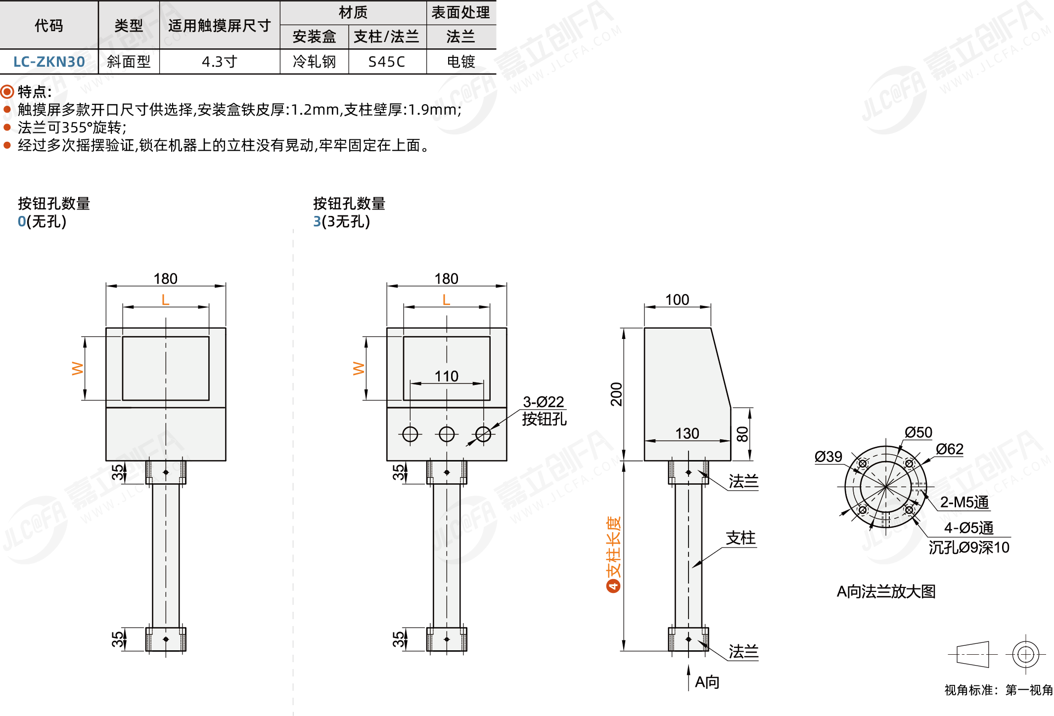 种类: 触摸屏安装盒安装类型: 立式安装方式: 法兰安装类型: 斜面型适用触摸屏尺寸: 4.3寸安装盒材质: 冷轧钢支柱/法兰材质: S45C法兰表面处理: 电镀
