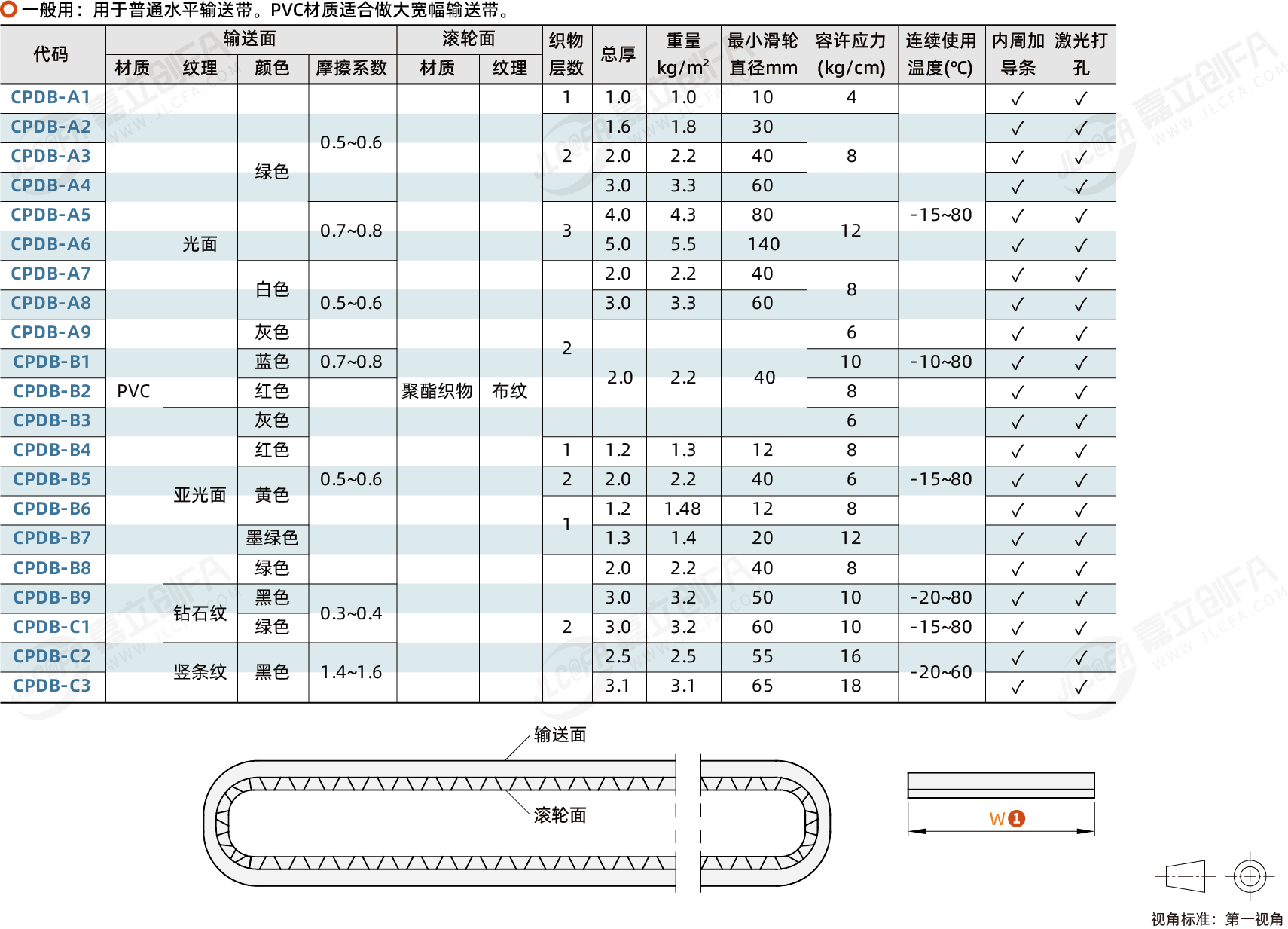 用途: 一般用输送面材质: PVC滚轮面材质: 聚酯织物滚轮面纹理: 布纹