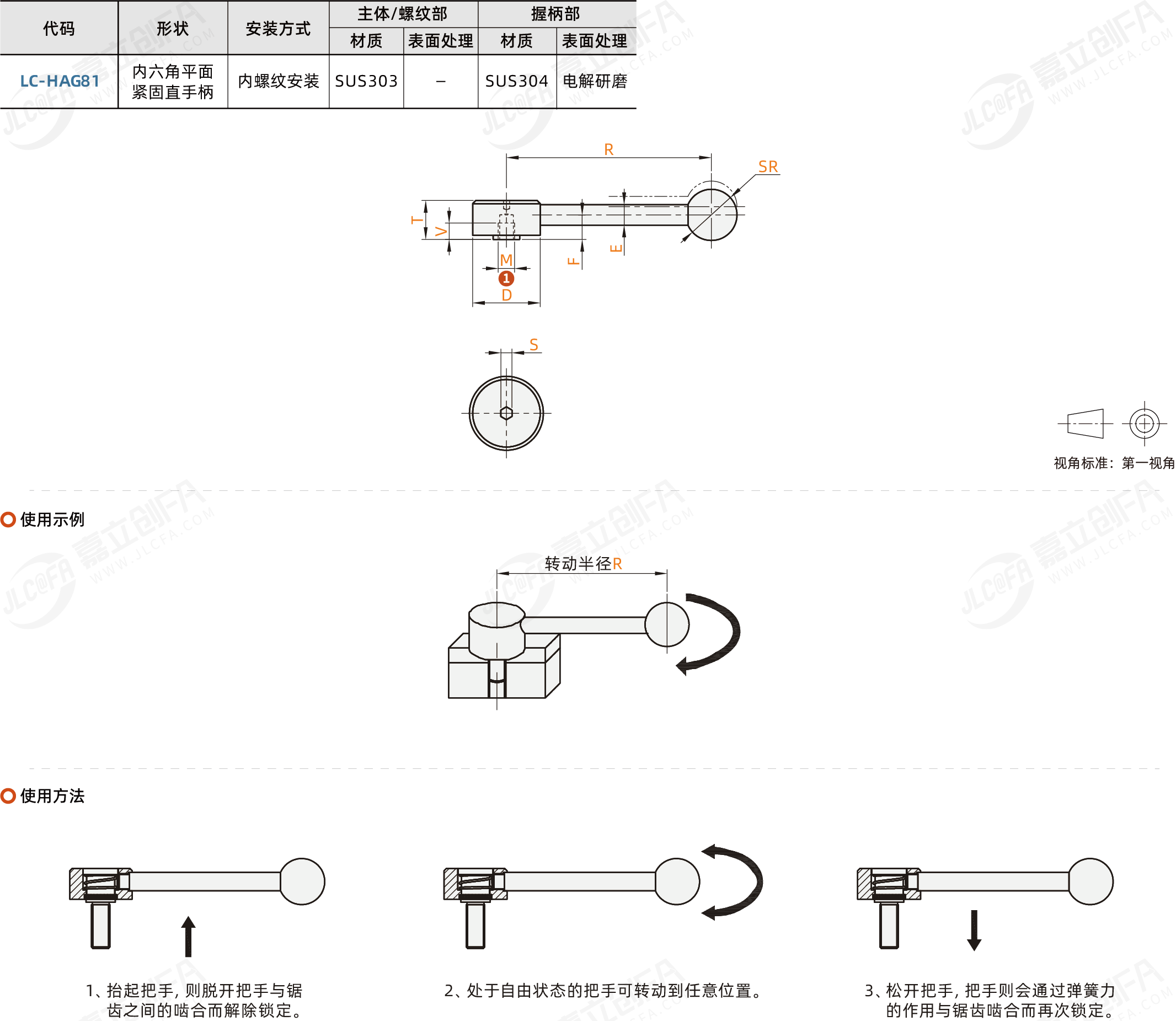 种类: 平面紧固手柄握柄类型: 紧定可调位型主体材质: SUS303形状: 内六角平面紧固直手柄安装方式: 内螺纹安装安装部材质: SUS303
