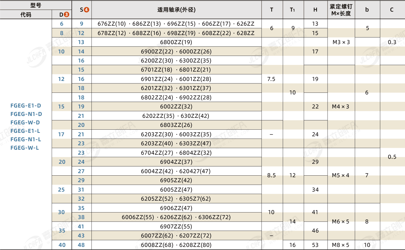 代码 | 特征 | 类型 | 轴固定方式 | 材质 | 表面处理 | 附件 |