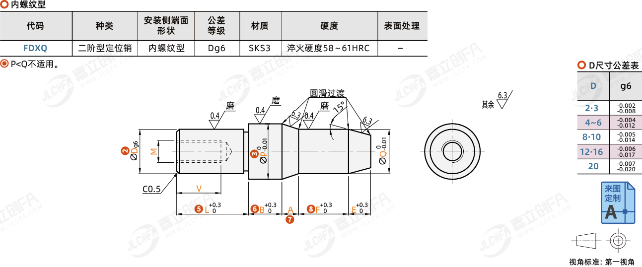 FDXQ二阶型定位销内螺纹型Dg6SKS3淬火硬度58~61HRC