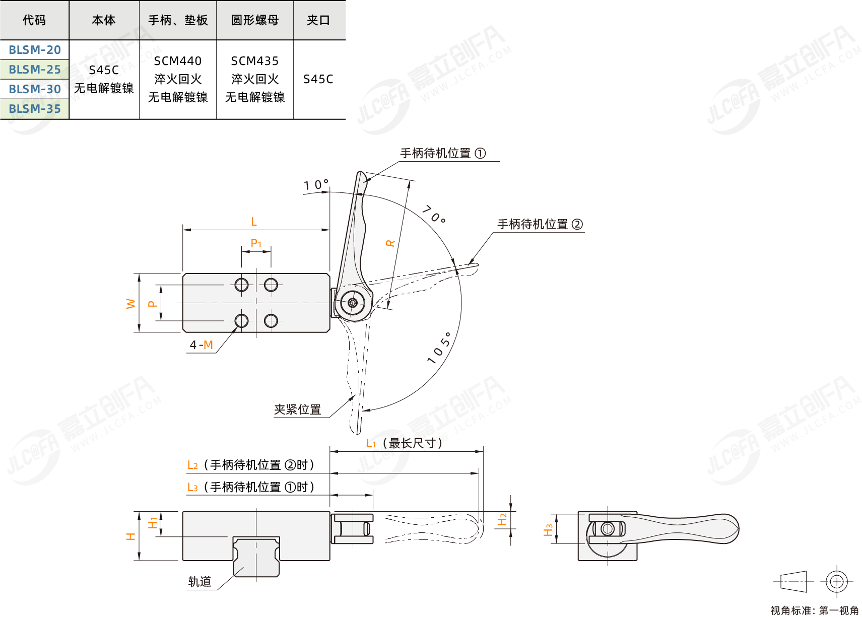 主体表面处理: 无电解镀镍主体材质: S45C手柄、垫板材质: SCM440手柄、垫板热处理: 淬火回火手柄、垫板表面处理: 无电解镀镍圆形螺母材质: SCM435圆形螺母热处理: 淬火回火圆形螺母表面处理: 无电解镀镍夹口材质: S45C