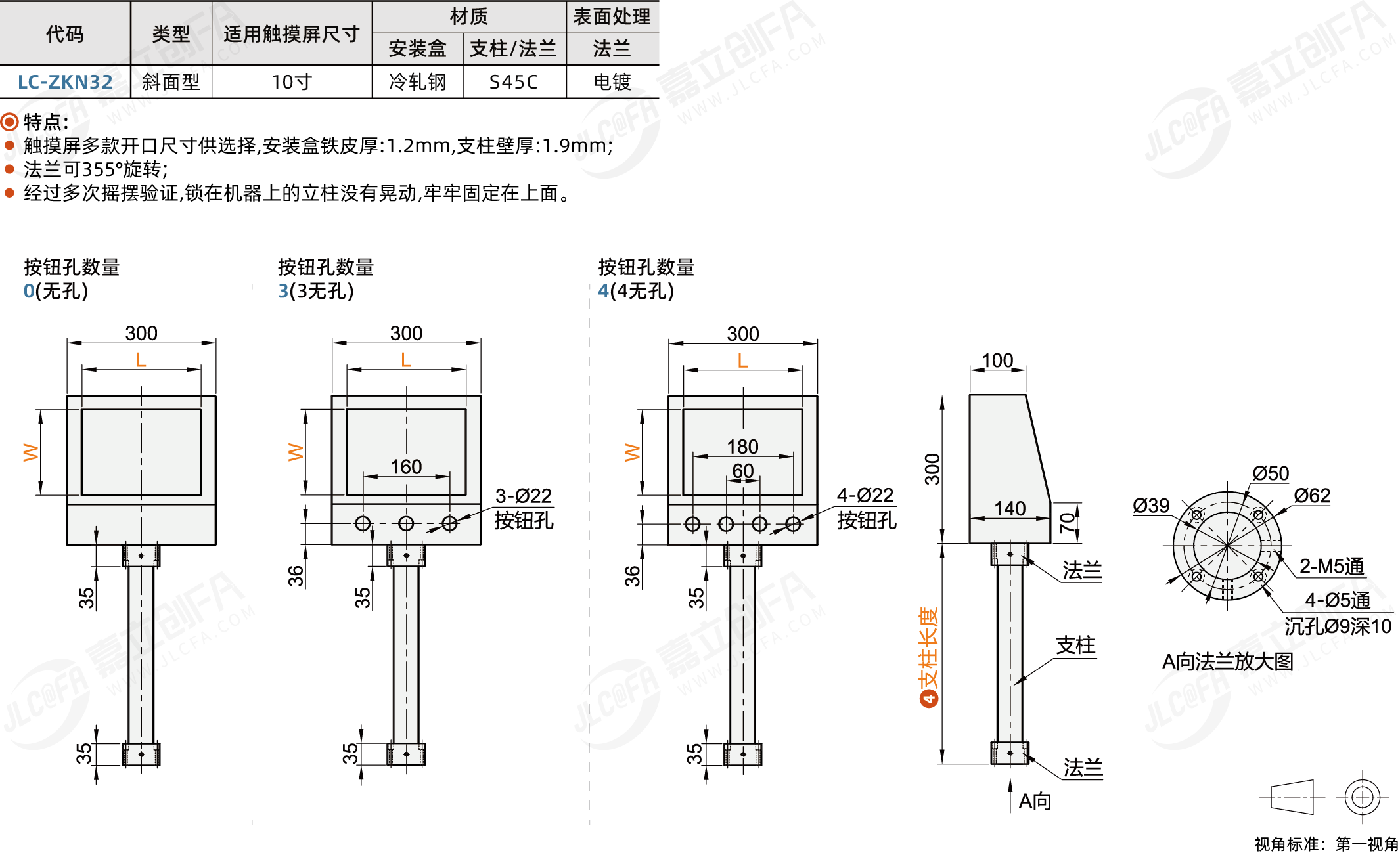 种类: 触摸屏安装盒安装类型: 立式安装方式: 法兰安装类型: 斜面型适用触摸屏尺寸: 10寸安装盒材质: 冷轧钢支柱/法兰材质: S45C法兰表面处理: 电镀