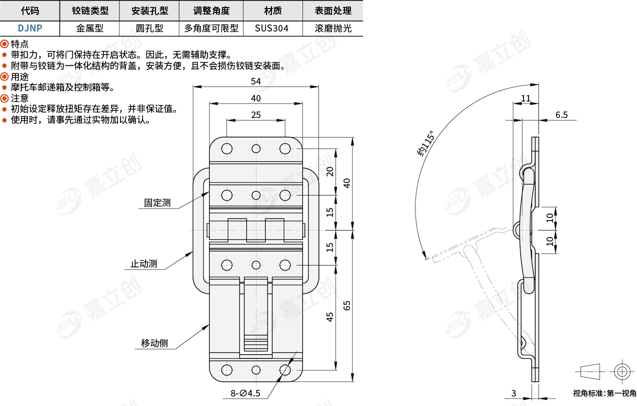 种类: 限位蝶形铰链安装孔型: 圆孔型材质: SUS304表面处理: 滚磨抛光铰链类型: 金属型调整角度: 多角度可限型