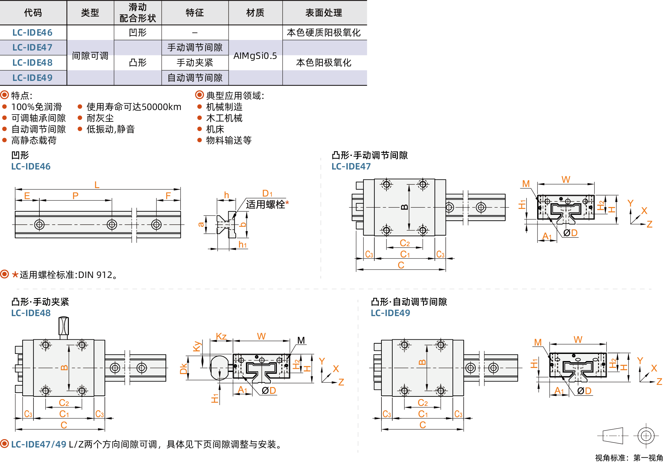 工业滑轨 单件 凹形滑轨/凸形滑块 间隙可调 平面滑动膜 重载型 材质AlMgSi0.5 阳极氧化